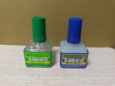 水貼貼上後,若是發現其位置不對需要調整,只要沒有刷軟化劑或是噴上透明保護漆,基本上只要在水貼周圍在塗上水,等段時間水便能溶解背膠而可以重新移動,但要是多次操作會導致背膠黏度降低,此時便需要使用水貼背膠強化劑。水貼背膠強化劑一般是在水貼黏貼前先刷在模型表面,不過Chris個人發現從水貼周邊滲入也有相當效果,若是水貼乾燥後容易掉或是貼上時飛邊的透明處有空氣在下方的銀色感便是水貼背膠黏附力不足,也需要使用背膠強化劑補強